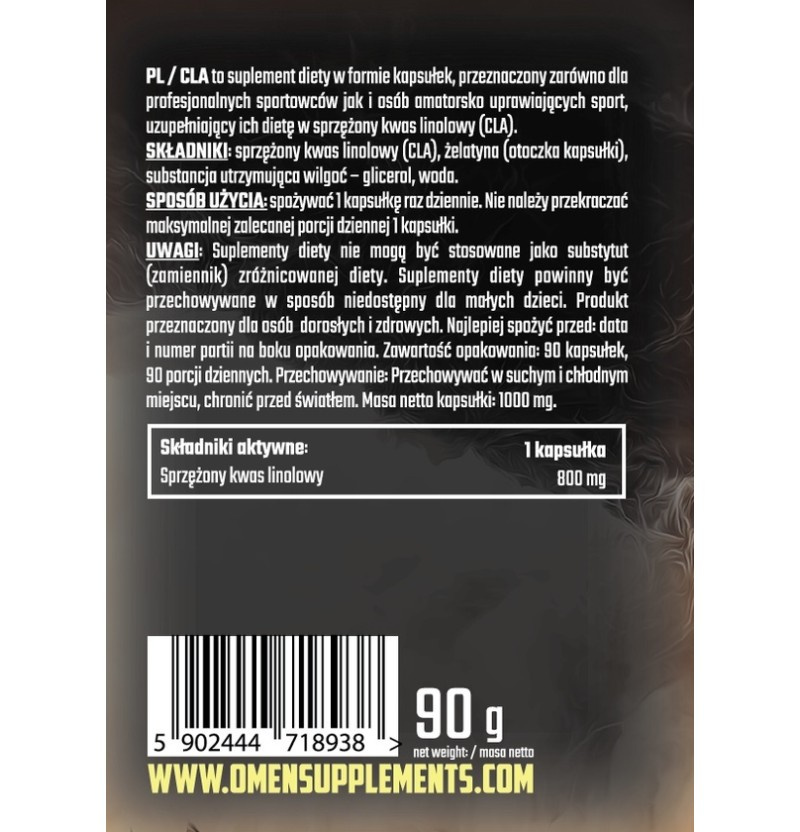 Omen CLA 90 kapsułek to preparat, który zawiera sprzężony kwas linolowy (CLA), naturalny składnik tłuszczowy, wspomagający procesy redukcji tkanki tłuszczowej. CLA pomaga poprawić metabolizm tłuszczy, wspiera zdrowie układu krążenia oraz może przyczynić się do utraty wagi, szczególnie przy regularnej aktywności fizycznej i odpowiedniej diecie. Produkt jest łatwy w stosowaniu dzięki kapsułkom, które można przyjmować codziennie, co czyni go wygodnym rozwiązaniem dla osób dążących do utrzymania zdrowej sylwetki i poprawy wydolności organizmu.