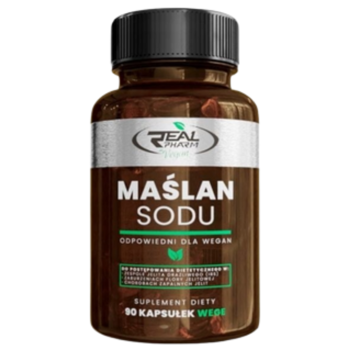 Real Pharm Maślan Sodu 90 caps Vege to preparat zawierający maślan sodu, który wspomaga zdrowie układu pokarmowego. Maślan sodu jest naturalnym związkiem, który może poprawiać funkcjonowanie jelit, wspierać regenerację błony śluzowej oraz pomagać w utrzymaniu prawidłowego metabolizmu. Produkt w formie wegetariańskich kapsułek.