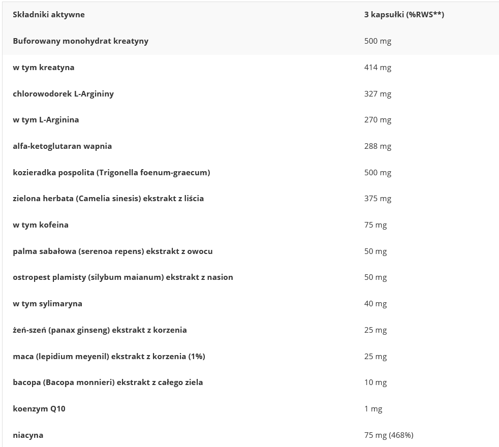 ekstrakt z nasion kozieradki (Trigonella foenum-graecum) (19%), monohydrat kreatyny (17%), otoczka kapsułki [żelatyna, substancja glazurująca (szelak), barwnik (tlenki i wodorotlenki żelaza), regulator kwasowości (wodorotlenek potasu), regulator kwasowości (wodorotlenek amonu)], chlorowodorek L-argininy 9,8%, alfa-ketoglutaran wapnia, preparat z ekstraktu guarany 7,5% [ekstrakt z nasion guarany (Paullinia cupana), kofeina], tlenek magnezu, chlorowodorek L-ornityny 3,8%, substancja wypełniająca (żel celulozowy), ekstrakt z Ashwagandhy 3,2% [ekstrakt z korzenia Ashwagandhy (Withania somnifera), maltodekstryna], ekstrakt z owoców boczni piłkowanej (Serenoa repens) 3%, kwas D-asparaginowy, ekstrakt z korzenia różeńca górskiego (Rhodiola rosea) 2,1%, ekstrakt z maca 1,7% [ekstrakt z korzenia maca (Lepidium meyenii), maltodekstryna], ekstrakt z korzenia pokrzywy zwyczajnej (Urtica dioica) 1,7%, ekstrakt z brokułów 1,5% [ekstrakt z kiełków brokułów (Brassica oleracea), maltodekstryna], bezwodna kofeina 1,5%, ekstrakt z owoców ostropestu plamistego (Silybum marianum) 1,5%, ekstrakt z liści szpinaku (Spinacia oleracea) 1,5%, amid kwasu nikotynowego, substancje przeciwzbrylające (sole magnezowe kwasów tłuszczowych, dwutlenek krzemu), ekstrakt z korzenia żeń-szenia koreańskiego (Panax ginseng) 0,8%, tlenek cynku, ekstrakt z ziela bakopy drobnolistnej (Bacopa monnieri) 0,3%, koenzym Q10, kwas nikotynowy, chlorowodorek pirydoksyny, ekstrakt z owoców pieprzu czarnego Bioperine® (Piper nigrum) 0,05%.