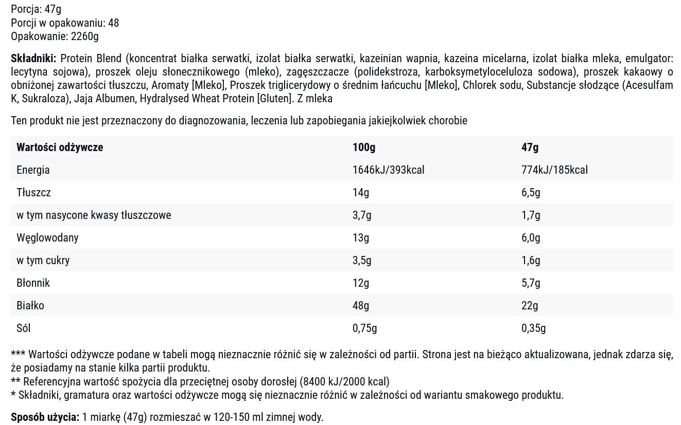 - Dz. T.: Porcja (44 g) rano, zaraz po przebudzeniu, 30 minut przed treningiem oraz bezpośrednio po treningu.