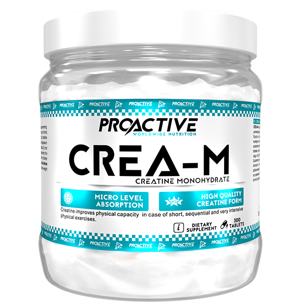 ProActive CREA-M to preparat w formie monohydratu kreatyny, jednej z najskuteczniejszych i najlepiej przyswajalnych form kreatyny (93%). Wspiera wzrost siły, wytrzymałości oraz produkcję ATP, dostarczając mięśniom energii. Produkt jest wolny od cukru, metali ciężkich i szkodliwych dodatków. Kreatyna trafia do krwi i transportowana jest do mięśni, wspomagając ich regenerację i rozwój.