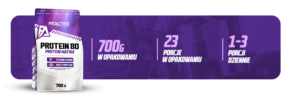 PROTEIN 80 to preparat białkowy w formie proszku, uzupełniający dietę w mieszaninę białek oraz witaminy. To produkt wspierający regenerację, wzrost siły i wytrzymałość mięśni.