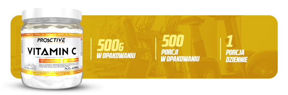 ProActive Vitamin C 500g to preparat zawierający dużą dawkę witaminy C, która wspiera układ odpornościowy i chroni organizm przed stresem oksydacyjnym. Pomaga w syntezowaniu kolagenu, co wspomaga zdrowie skóry, stawów i naczyń krwionośnych. Dodatkowo witamina C wspiera metabolizm energetyczny i pomaga w redukcji zmęczenia, co czyni ją idealnym suplementem w okresach intensywnego wysiłku fizycznego lub obniżonej odporności.