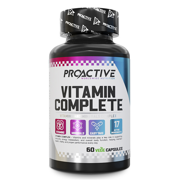 Proactive Vitamin Complete to wysokiej jakości suplement diety, zawierający 17 aktywnych składników w starannie dobranych dawkach (200% RWS). Formuła łączy witaminy, minerały oraz pierwiastki śladowe, które wspierają odporność, metabolizm energetyczny, zdrowie układu nerwowego oraz ogólną witalność organizmu. Produkt w wygodnych kapsułkach wegetariańskich, bez żelatyny, odpowiedni dla osób dbających o zdrowy styl życia.