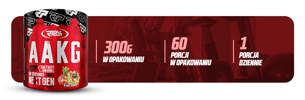 Real Pharm AAKG 300g to preparat w formie proszku, zawierający alfa-ketoglutaran L-argininy (AAKG). Produkt jest przeznaczony zarówno dla profesjonalnych sportowców, jak i osób amatorsko uprawiających sport, mających na celu uzupełnienie diety w AAKG. Stosowanie tego preparatu może przyczynić się do zwiększenia efektu "pompy mięśniowej", poprawy siły i wytrzymałości oraz lepszego ukrwienia mięśni.