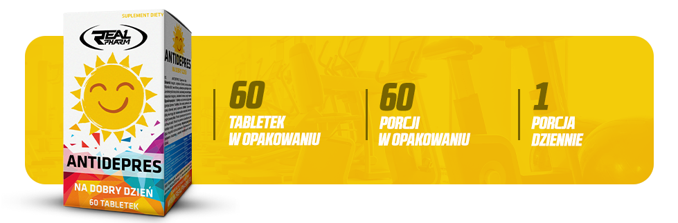 Real Pharm Antidepres 60 tabl. to preparat wspomagający poprawę nastroju i redukcję stresu. Dzięki starannie dobranej formule, preparat może pomóc w utrzymaniu dobrego samopoczucia, a także w walce z objawami depresji i nadmiernym stresem. Zawiera składniki aktywne, które wspierają prawidłowe funkcjonowanie układu nerwowego i hormonalnego, pomagając w naturalny sposób regulować poziom serotoniny i innych neuroprzekaźników odpowiedzialnych za nastrój.