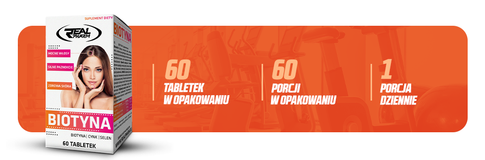 Real Pharm Biotyna 60 tab to preparat dostarczający biotynę (witaminę B7). Biotyna (witamina B7, H) to rozpuszczalna w wodzie witamina z grupy B, kluczowa dla metabolizmu węglowodanów, tłuszczów i białek. Wspiera zdrowie włosów, skóry i paznokci, poprawiając strukturę keratyny i zapobiegając wypadaniu włosów. Może także wspomagać funkcje poznawcze, zmniejszać stan zapalny, regulować poziom cukru we krwi i poprawiać profil lipidowy. Organizm jej nie magazynuje, dlatego ważne jest regularne stosowanie, szczególnie dla osób z niedoborami, kobiet w ciąży i karmiących. Biotyna odgrywa również rolę w leczeniu niektórych schorzeń, jak hipoglikemia czy hiperlipidemia.