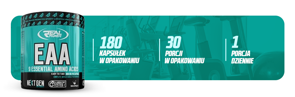 Real Pharm EAA 180 kapsułek to preparat dostarczający niezbędnych aminokwasów egzogennych (EAA), które wspomagają wzrost i regenerację mięśni, a także ochronę przed katabolizmem. EAA są kluczowe dla syntezy białek i odbudowy tkanek mięśniowych, co sprawia, że stosowanie jest szczególnie ważne dla osób intensywnie trenujących.