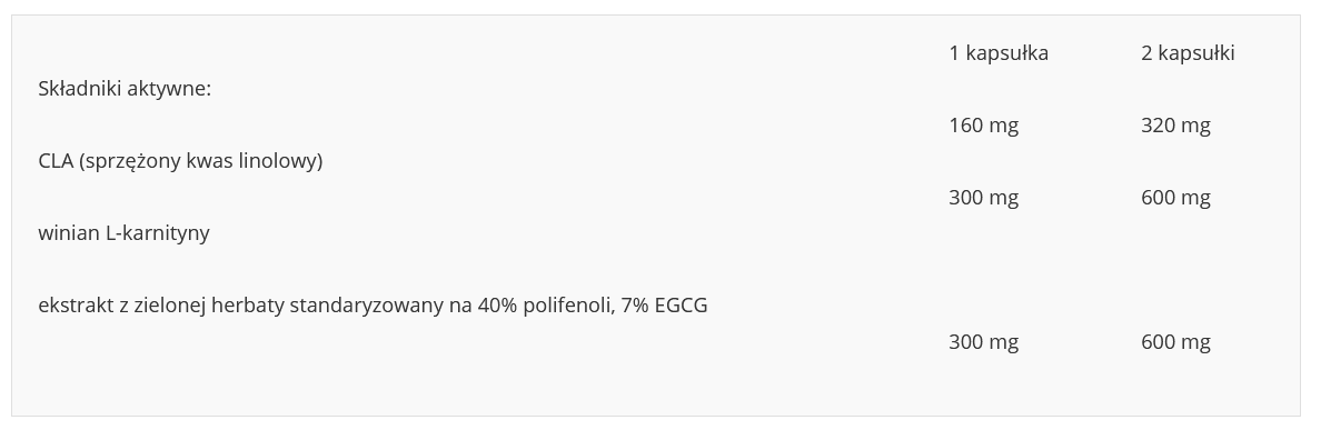 ekstrakt z liści zielonej herbaty Camellia sinensis standaryzowany na 40% polifenoli, 7% EGCG, winian L-karnityny, sprzężony kwas linolowy, substancja wypełniająca – celuloza, nośnik – fosforany wapnia, substancje przeciwzbrylające – sole magnezowe kwasów tłuszczowych, dwutlenek krzemu. Otoczka kapsułki: woda, żelatyna. Sposób użycia: spożyć 1 kapsułkę 2 razy dziennie. Zalecana porcja dzienna: 2 kapsułki dziennie. Nie należy przekraczać zalecanej do spożycia porcji dziennej (2 kapsułki).
