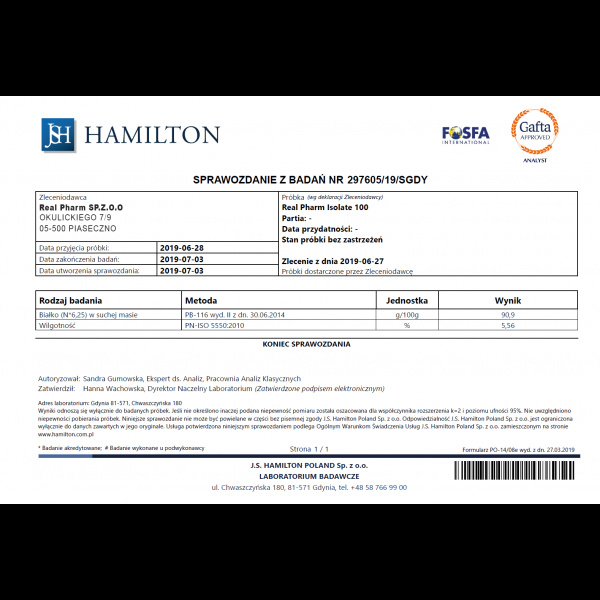 REAL PHARM REAL ISOLATE 100 to izolat białka serwatkowego, który wyróżnia się niską zawartością tłuszczu i węglowodanów, co czyni go idealnym wyborem dla osób dążących do budowania masy mięśniowej oraz redukcji tkanki tłuszczowej. Produkt ten nie zawiera zbędnych dodatków, sztucznych barwników ani konserwantów, dzięki czemu jest bezpieczny i naturalny. Izolat białka serwatkowego jest jednym z najbardziej wartościowych źródeł białka, które wspomaga regenerację po wysiłku fizycznym, przyspiesza procesy anaboliczne oraz wspiera budowanie czystej masy mięśniowej.