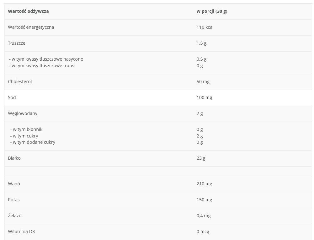 mieszanka białek mlecznych (koncentrat białka serwatkowego*, kazeina micelarna*), mieszanka białek niemlecznych (peptydy glutaminy, białko jaja kurzego), aromaty naturalne i sztuczne, lecytyna, sól, acesuflame-K, sykraloza.